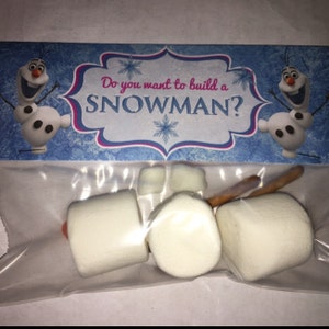 Do You Wanna Build a Snowman Printable Bag Topper 3 Copies Printable Treat Bag Toppers 18 Large Marshmallows 30 Pretzel Sticks 18 Raisins or Chocolate Chips 6 Clear Sandwich Bags Stapler Instructions Head over HERE to download both the Snowman Kit printable as well as the Do you wanna build a snowman printable. There are two toppers per page; so these make a quick, easy and super cheap party idea.