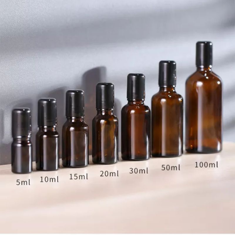 200 x 5ml 10ml 15ml 20ml 30ml 50ml 100ml Amber Boston Round Glass Essential oil Bottle With Black Silver Lids PE insert