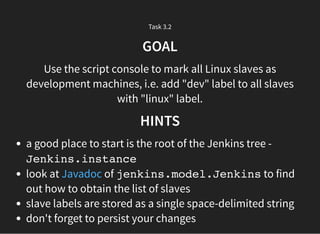 Managing Nodes Go back to the node's web page in Jenkins. If everything works then page should say "Agent is connected" Stop the command (control-c) Register a new scheduled job to run the same command Open "Task Scheduler" on your windows machine Start → Run: task Scheduler Create a basic task (Menu: Action → Create Basic Task) First page of the wizard: › doc › pipelinePipeline: Input Step Defines how selected offline nodes should be handled. All Nodes - trigger the job on all selected nodes, regardless of there online/offline state; Ignore Offline Nodes - trigger the job only on nodes being online and having an executor; Ignore Temp Offline Nodes - trigger the job on all selected nodes except on the ones currently manually ... Continuous Integration - TIBCO BW & Jenkins and TFS We decided to configure continuous integration using Jenkins in order to short and automate development process. Main goal was: A developer checks-in TIBCO BW project → Jenkins triggers the check-in → Validate project by "validateproject.exe" tool →Build a project ear file (used for deployment) by "buildear.exe" tool → Deploy project to ... Jenkins : Display Information About Nodes This scripts displays a bunch of information about all the slave nodes. ... In Jenkins, simply click on "Manage Jenkins", and then click on "Script Console" and paste the following code. The entire list of methods for a "Computer" object can be found here: ...