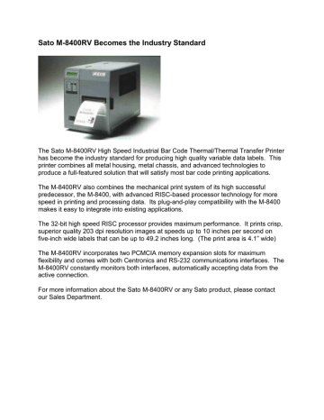 M84Pro Industrial Thermal Printer by SATO - SATO Asia Pacific The M84Pro Series is built to be the rugged industrial generation of high performance printers with high resolution capabilities. The M84Pro offers user configurable print resolutions of 203, 305, and 609 dpi and its powerful electronics provide high throughput and print speeds of 10, 8 and 6 ips at 203, 305 and 609 dpi respectively.