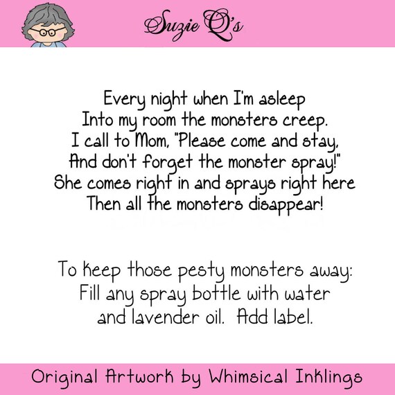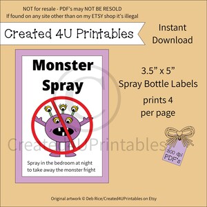 Monster Spray Printable Labels - 5 Pack Digital Downloads Monster Spray is here! Help your child cope with nighttime anxiety with this cute and fun DIY project. You are buying a digital product. Simply download, print, to make your own monster spray. Monster Spray Digital Labels come in 5 different variations, including vampire, witch, ghost, zombie, and classic monster spray jpeg files.