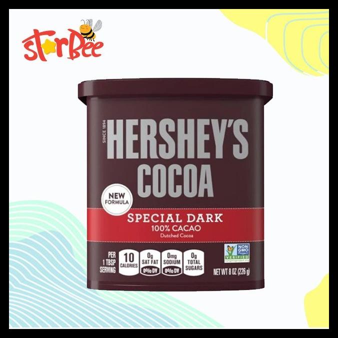 HERSHEY'S COCOA SPECIAL DARK 100% Cacao Cocoa HERSHEY'S cocoa Gluten Free Kosher Nutrition Information Nutrition Facts Servings Per Container about 45 Serving size 1 tbsp (5g) Amount per serving Calories 10 % Daily Value* Total Fat 0.5g 1% Saturated Fat 0g 0% Trans Fat 0g Cholesterol 0mg 0% Sodium 0mg 0% Total Carbohydrates 3g 1% Dietary Fiber 2g 6% Total Sugars 0g Includes 0g Added Sugar 0%