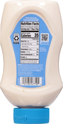 Hellmann's, Real Mayonnaise - SmartLabel™ - Unilever Saturated Fat 1.5 g 8%. Trans Fat 0 g. Polyunsaturated Fat 6 g. Monounsaturated Fat 2.5 g. Cholesterol 5 mg 2%. Sodium 90 mg 4%. Total Carbohydrate 0 g 0%. Protein 0 g. Not a significant source of dietary fiber, total sugars, added sugars, vitamin D, calcium, iron and potassium. Mayonnaise Nutrition Facts - Eat This Much How many calories are in Mayonnaise? Amount of calories in Mayonnaise: Calories 100. Calories from Fat 99 ( 99 %) % Daily Value *. How much fat is in Mayonnaise? Amount of fat in Mayonnaise: Total Fat 11g. -. Mrs. Taste Zero Sodium Mayonnaise - 11oz. - Healthy Heart Market Nutrition Facts Serving Size: 1 Tbsp Servings per Container: 27 Calories: 0 Total Fat: 0g Saturated Fat: 0g Trans Fat: 0g Cholesterol: 0mg Sodium: 0mg Total Carbohydrate: 0g Dietary Fiber: 0g Sugar: 0g Protein: 0g Ingredients: Filtered Water, Vinegar, Pasteurized Egg White (Egg), Extra Virgin Olive Oil, Potassium Chloride, Dehydrated Onion, Mustard Sauce, Dehydrated Garlic, Flavors, Microcrystaline Cellulose, Carboxymehtylcellulose, Potassium Sorbate, Sodium Benzoate, Citric Acid, Sucralose. Mayonnaise, fat free nutrition facts and analysis. The latter is 17 g sugar and 5.1 g of dietary fiber, the rest is complex carbohydrate. Mayonnaise, fat free contains 0 g of saturated fat and 0 mg of cholesterol per serving. 256 g of Mayonnaise, fat free contains 5.12 mcg vitamin A, 0.0 mg vitamin C, 0.00 mcg vitamin D as well as 0.26 mg of iron, 15.36 mg of calcium, 128 mg of potassium.