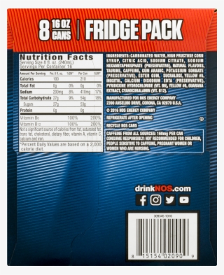 Nutrition Facts of NOS Energy Drink (Detailed Guide) Apr 20, 2021 — NOS is a very popular energy drink brand rich in B-Vitamins as shown on its Nutrition Facts label. It contains 210 calories, 410 mg of ...