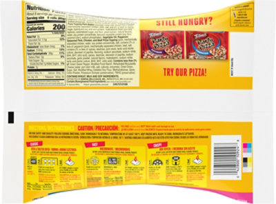 Totino's Party Pizza, Pepperoni Flavored, Frozen Snacks, 10.2 oz, 1 ct ... Nutrition facts. Refer to the product label for full dietary information, which may be available as an alternative product image. 2 Servings Per Container. Amount per serving. Calories 350. ... Enjoy classic flavorful thin-crust pizza anytime with Totino's Pepperoni Party Pizza. Made with a delicious tasty crust and irresistibly cheesy ... Pepperoni pizza rolls by TOTINOIS nutrition facts and analysis. The latter is 3 g sugar and 1 g of dietary fiber, the rest is complex carbohydrate. Pepperoni pizza rolls by TOTINOIS contains 2.5 g of saturated fat and 10 mg of cholesterol per serving. 102 g of Pepperoni pizza rolls by TOTINOIS contains 0.0 mg vitamin C as well as 1.80 mg of iron, 20.40 mg of calcium. Pepperoni pizza rolls by TOTINOIS belong ... Classic Pepperoni Party Pizza | Pizza Snacks | Totino's contains less than 2% of: rehydrated fat free mozzarella cheese (water, skim milk, cheese cultures, salt, enzymes, citric acid, vitamin a palmitate, vitamin b6), modified corn starch, sugar, salt, dry yeast, defatted soy flour, dextrose, spice, monocalcium phosphate, baking soda, beet powder, rehydrated enzyme modified cheese (water, milk, cheese … Totino's Pizza Rolls, Pepperoni: Calories, Nutrition ... - Fooducate tomato puree (water, tomato paste), enriched flour (wheat flour, niacin, iron, thiamin mononitrate, riboflavin, folic acid), pepperoni pizza topping (pepperoni made with pork, chicken and beef [pork, mechanically separated chicken, beef, salt, spice, dextrose, oleoresin of paprika, sodium ascorbate, garlic powder, sodium nitrate, lactic acid …