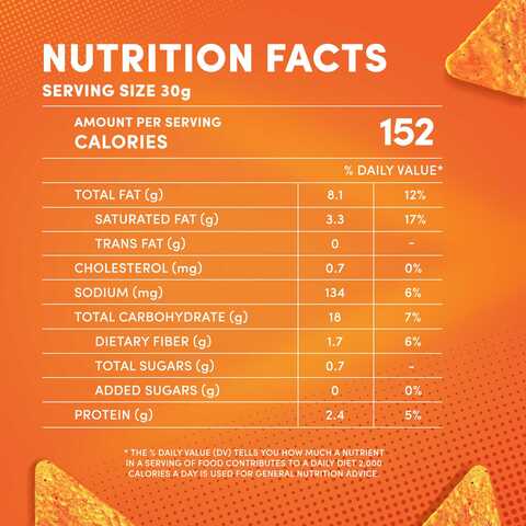 Doritos Nacho Cheese Flavored Tortilla Chips, Party Size, 14.5 oz … Refer to the product label for full dietary information, which may be available as an alternative product image. About 15 Servings Per Container. Serving Size About 12 Chips (28g) Amount per serving. Calories 150. Amount per serving % Daily Value* Total Fat 8.00000g: 10%: Saturated Fat 1g: 6%: Trans Fat 0g: Cholesterol 0.00mg: 0%: Sodium 210mg: 9%: Total Carbohydrate …