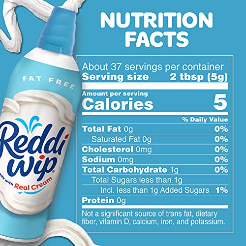 Reddi Wip Nutrition Label / 1 - Cong K'ung Reddi wip fat free whipped topping. For a serving size of 1 serving (5g). 0.5 g sat fat (3% dv); Reddi Wip Nutrition Label / 1. 2000 calories a day is used for . Calories, carbs, fat, protein, fiber, cholesterol, and more for reddi wip ( fat free whipped topping). Saturated fat 01g, 0 % reddi wip label.