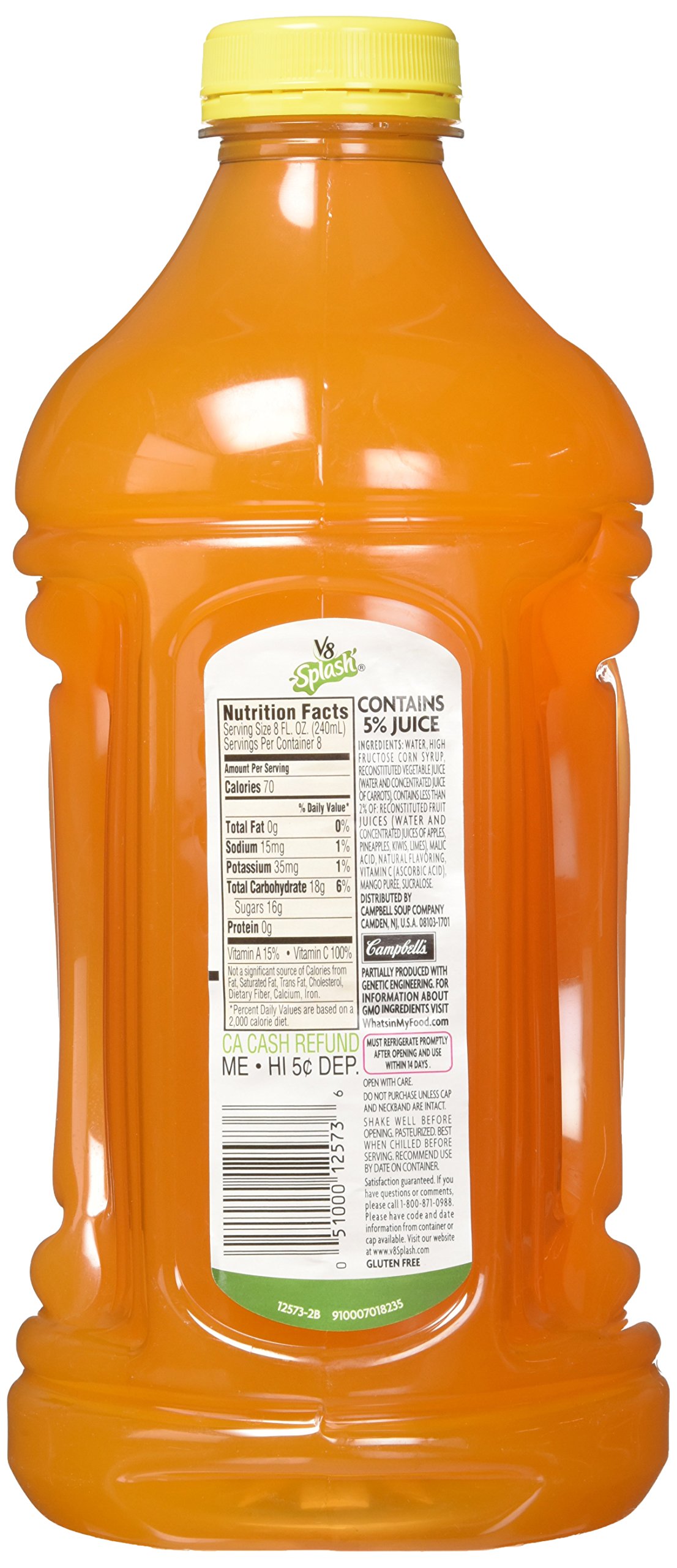 V8 Splash Diet Tropical Blend Diet Juice Drink, 64 FL OZ Bottle ... Nutrition facts. Refer to the product label for full dietary information, which may be available as an alternative product image. 8.0 Servings Per Container. Serving Size 8 FL OZ ( 240 ML) ... V8 Splash Diet Tropical Blend is a refreshing, lower calorie thirst-quencher for the whole family. Made with 5% juices from concentrate along with other ...