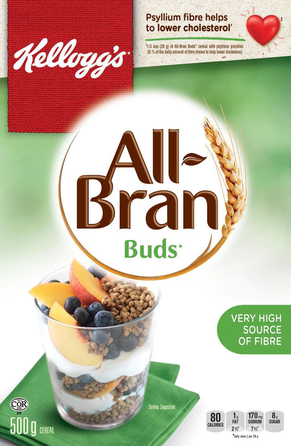 Kellogg's All-Bran Buds Cereal, 500g | Walmart Canada #StartSimple - Just 1/3 cup (28 g) of All-Bran Buds is a real food solution with multiple benefits: Psyllium fibre to help lower cholesterol and support a healthy heart+, Wheat bran fibre to promote regularity, High fibre, which may assist in weight maintenance as part of a healthy diet and an easy way to add fibre into your favourite recipe