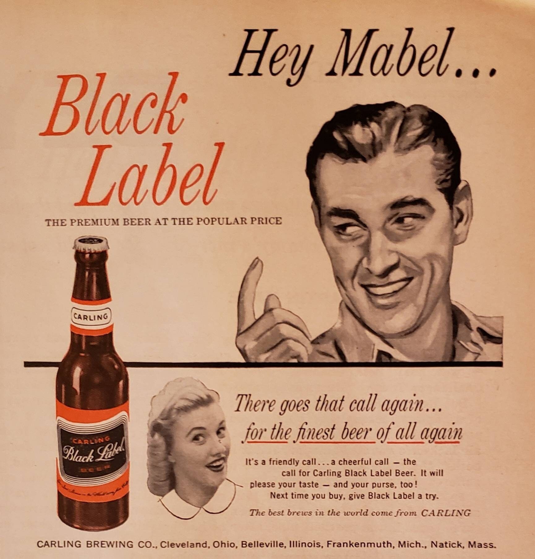 Hey, Mabel! Black Label | Carling black label, Black label, Beer ... Black and White animated film. 60 seconds. 119 words. Air date 1954.Carling Brewing Co., AdvertiserLang, Fisher & Stashower, Inc., (Cleveland), Agency.Storyb... E, Elizabeth Buckler, 145 followers, More information, Hey, Mabel! Black Label, Find this Pin and more on ART DESIGN TYPE. by Elizabeth Buckler. Beer Commercials, Canadian Beer, New Bands,