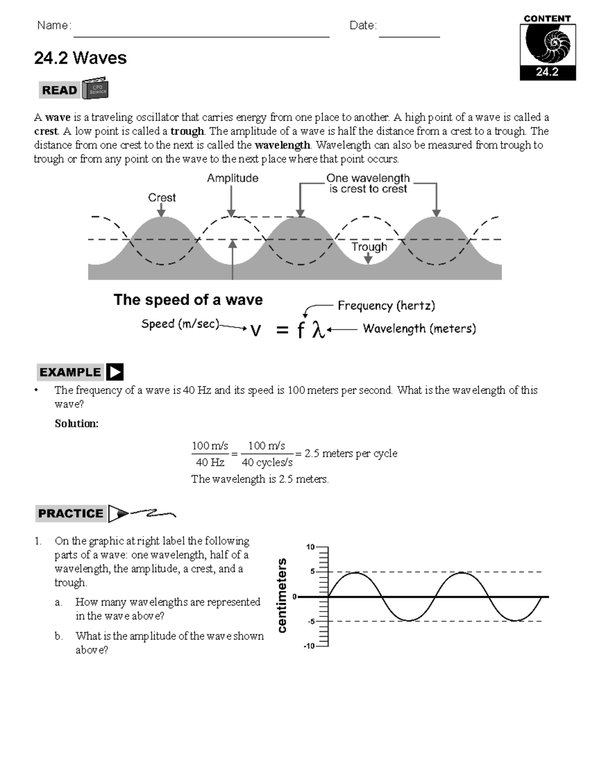 Amplitude, Frequency, Wavelength, Crest, and Trough - YouTube Oct 8, 2018 ... Label & Draw Transersve Waves: Amplitude, Frequency, Wavelength, Crest, and Trough ... Learn how to QUICKLY label a transverse wave with crest, ... › userfiles › 36Waves, Sound, and Light What are waves? When you float in the pool on a warm summer day, the up-and-down movement of the water tells you waves are moving past. Sometimes the waves are so strong they almost push you over. Other times, the waves just gently rock you. You know about water waves because you can see and feel their movement, but there are other types of ... Label Parts Of A Wave Teaching Resources | Teachers Pay Teachers Results 1 - 24 of 35+ ... Science worksheets: Label parts of a waveStudents have to parts of a wave (Amplitude,Wavelength, Wave crest,Wave trough)2 VERSIONS OF ... Solved 1. Label the parts of a wave: wavelength, crest, | Chegg.com Question: 1. Label the parts of a wave: wavelength, crest, trough, and wave height 2. When does a wave "feel bottom" (wave base)? Express this in relation to ...