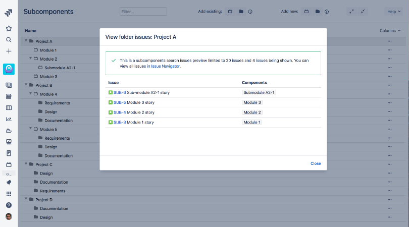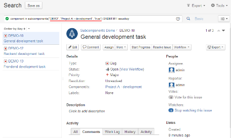 Organize your Jira issues with subcomponents - Work Life by Atlassian Apr 29, 2021 ... The main purpose of Subcomponents for Jira is so that users can convert their existing flat list of components into a subcomponents hierarchy. Subcomponents - Moodle Tracker Subcomponents. You can query issues in a component ... Powered by a free Atlassian Jira open source license for Moodle. Try Jira - bug tracking software for ... Subcomponents for Jira Cloud | Atlassian Marketplace With just few clicks you can convert a plain list of Jira project components into hierarchical tree of components-subcomponents to visualize Jira project ...