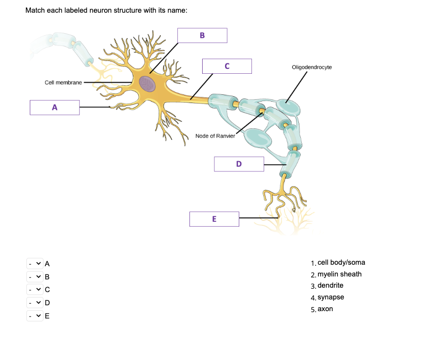 Neuron structure labeled. The synapse (article) | Human biology | Khan Academy The action happens at the synapse, the point of communication between two neurons or between a neuron and a target cell, like a muscle or a gland. At the synapse, the firing of an action potential in one neuron—the presynaptic, or sending, neuron—causes the transmission of a signal to another neuron—the postsynaptic, or receiving, neuron—making the postsynaptic neuron either more or less likely to fire its own action potential. A Labelled Diagram Of Neuron with Detailed Explanations - BYJUS A neuron is a specialized cell, primarily involved in transmitting information through electrical and chemical signals. They are found in the brain, spinal cord and the peripheral nerves. A neuron is also known as the nerve cell. The structure of a neuron varies with their shape and size and it mainly depends upon their functions and their location. The Neuron – Foundations of Neuroscience - Michigan State... Neuron structure is variable, but the main components of cell body (shown in black), dendrites (shown in brown), and axon (shown in blue) are common among all neurons. ‘Neuron Types‘ by Casey Henley is licensed under a Creative Commons Attribution Non-Commercial Share-Alike (CC-BY-NC-SA) 4.0 International License. Types of Neurons: Parts, Structure, and Function - Verywell... Jan 10, 2022 · Types of neurons based on structure include: Unipolar neurons: These neurons have a single long axon that is responsible for sending electrical signals. The axon in unipolar neurons is myelinated, which allows for rapid signal transmission. Multipolar neurons: These neurons are able to receive impulses from multiple neurons via dendrites.